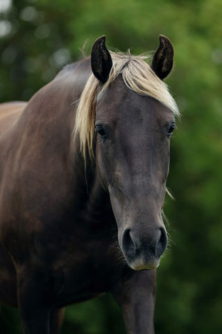 Most of our horses have a rare dilution gene called the silver gene ('Z' gene), sometimes called 'silver dapple'. The silver gene is common in small equines (Shetlands, Highlands, Minis) and is extremely common in the the French draught breed (Comtois) and in many gaited breeds. However, it is very rare in most other breeds, and especially rare in sporthorses. The gene only acts on black pigment, and thus hides on chestnut (red) based horses. On black or bay based horses, it often causes a stunning effect of the mane and tail becoming blonde/flaxen/white. Other markers of the gene can include white eyelashes, striped hooves, diluted points (bay silvers) and body coat dapples. Expression of silver can vary, but most of our horses are 'loudly' expressed.